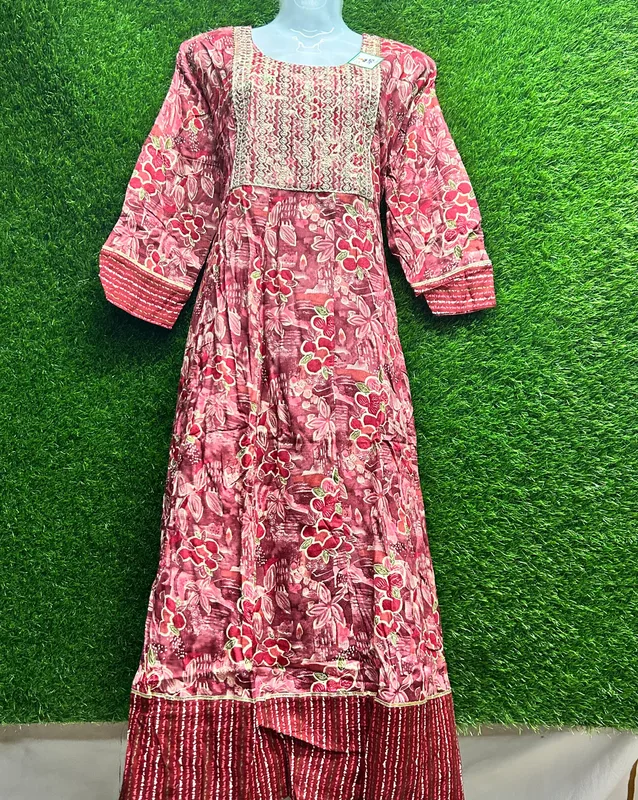 This women's top features a pink base with large floral and leaf patterns in brown. It has short sleeves, is loose-fitting, suitable for casual wear or festive occasions.
