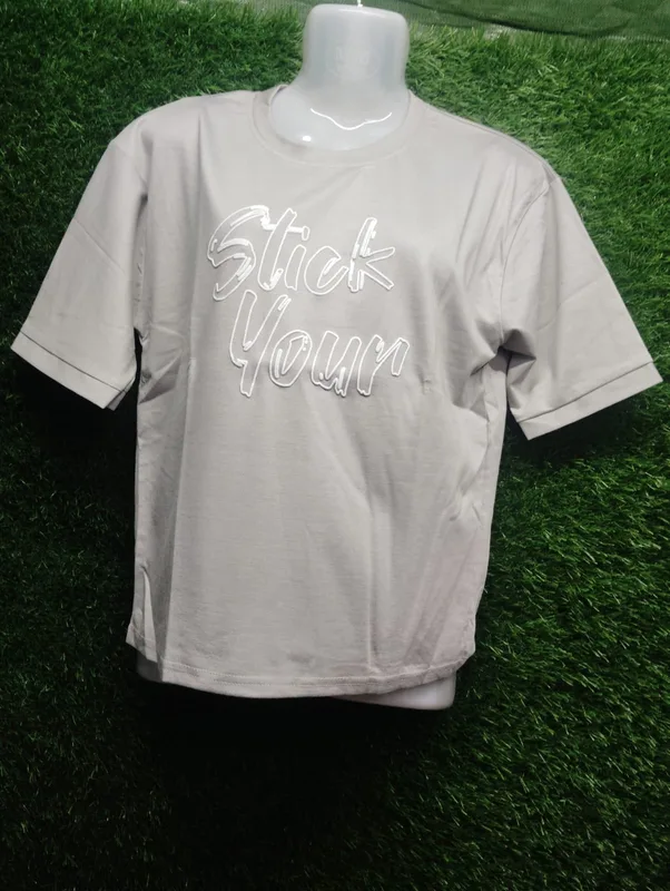 This pink cotton graphic t-shirt features a playful white 'Stick Your' print with an elegant cursive style. It has short sleeves and is designed for casual wear.