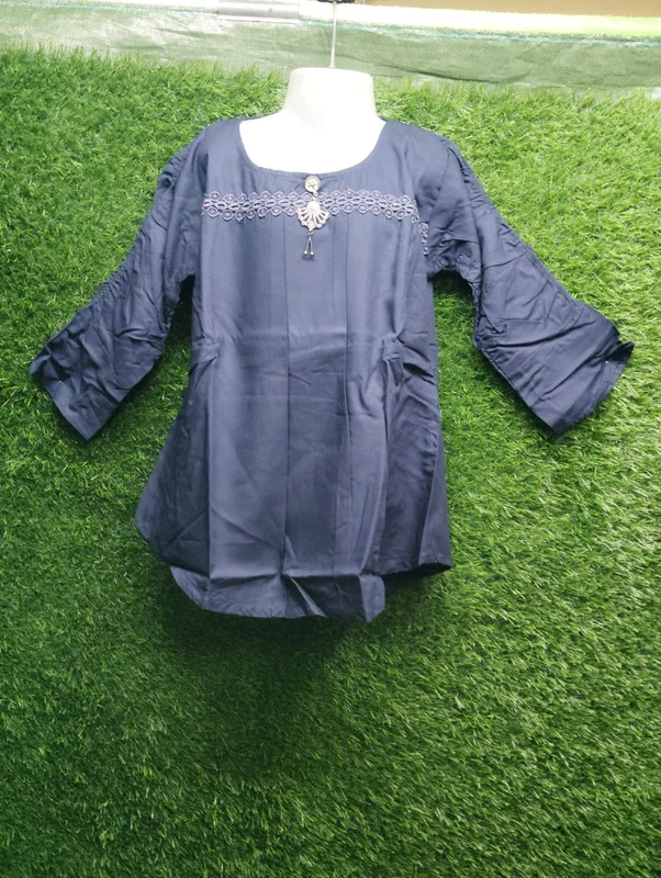 This women's cotton long-sleeve shirt features a relaxed fit and is designed for casual wear. It has a spread collar with decorative lace trim at the neckline.