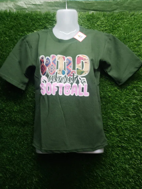 This top is designed with a playful softball theme featuring bold lettering and graphic designs. It has short sleeves suitable for casual wear or sports activities.