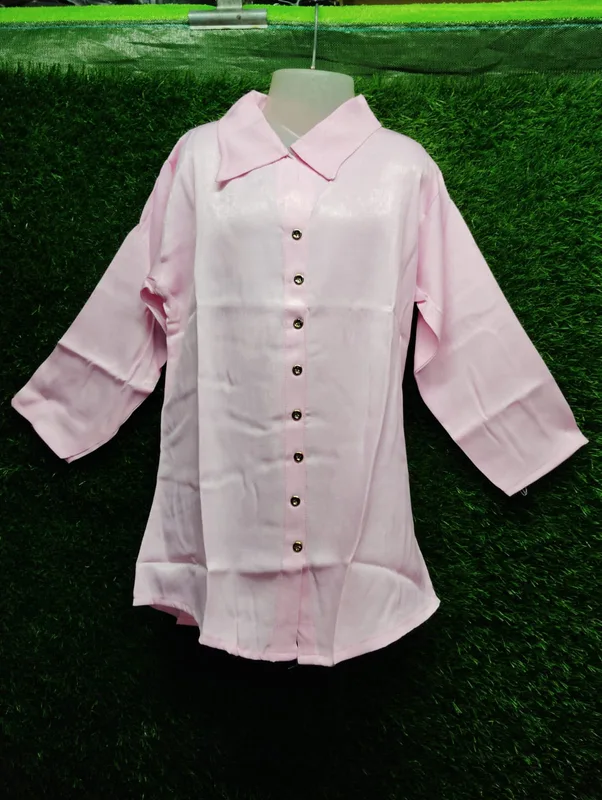 This women's shirt features a satin fabric with a pink hue. It has long sleeves and comes with a mandarin collar. The front is adorned with vertical buttons down the center for closure.