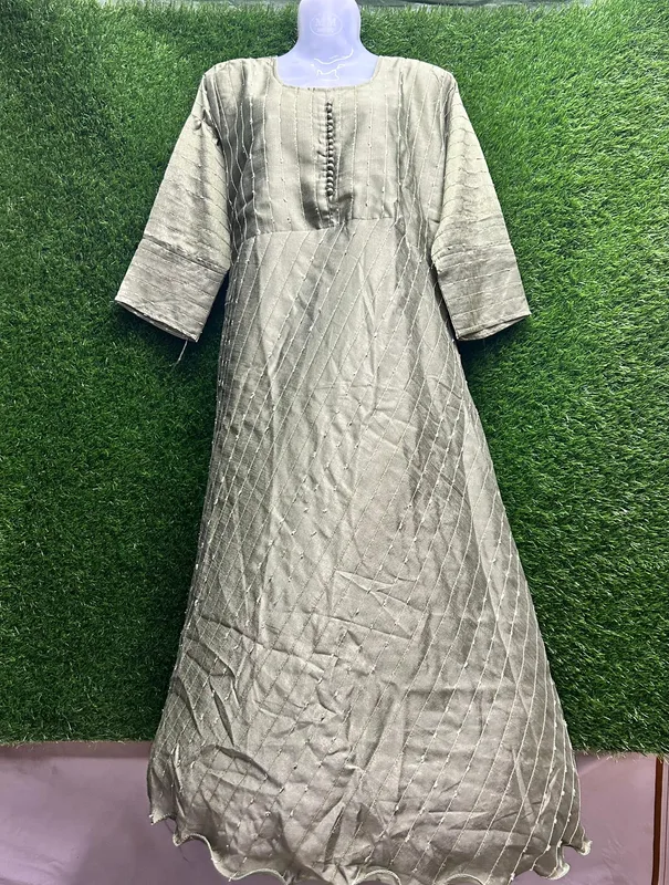 This elegant rayon tunic features a sophisticated pattern with gold and blue embellishments. The garment has long sleeves that end in an intricate lace hem for added detail.