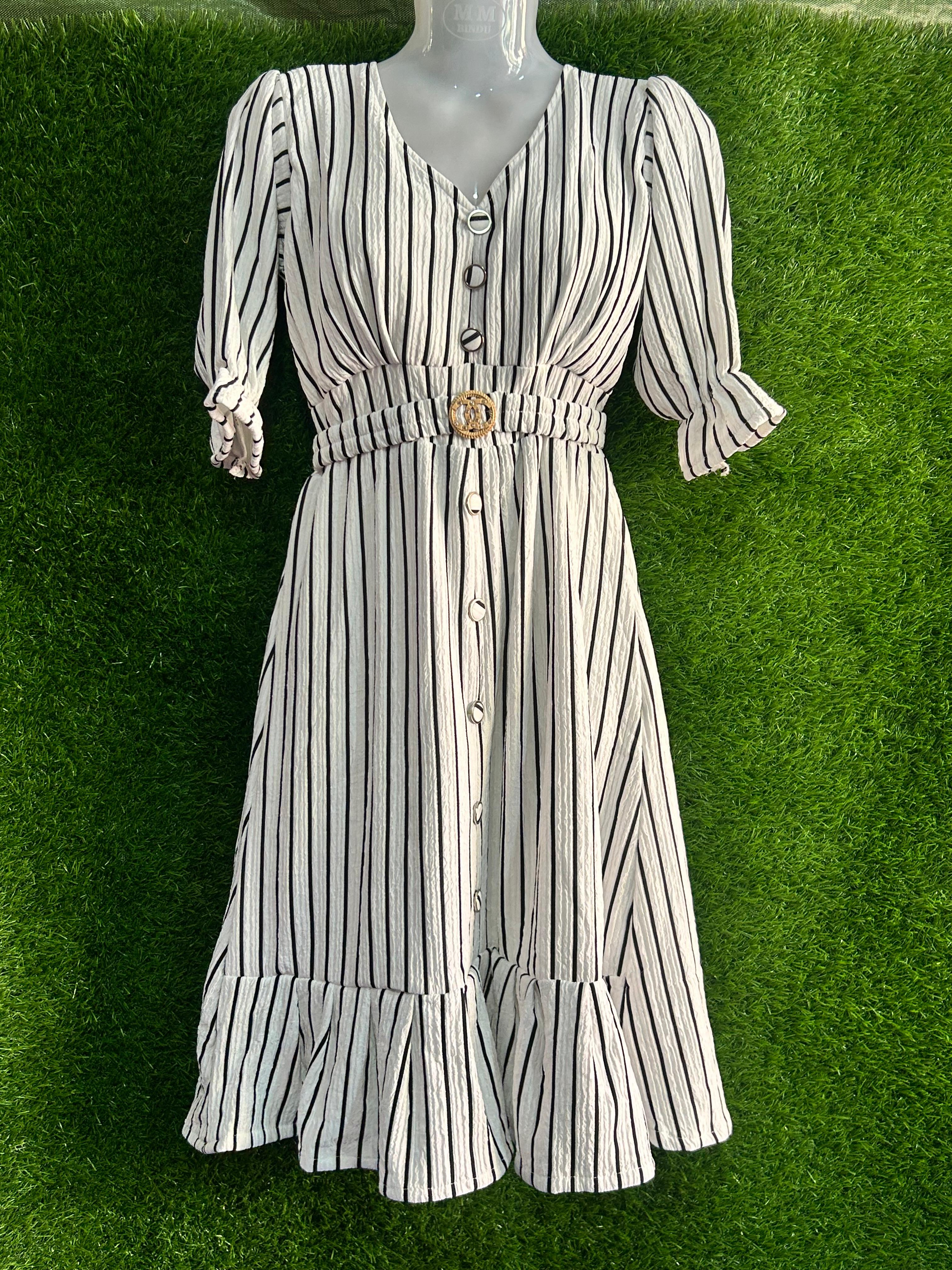 Women’s Beige Vertical Stripe Midi Dress with Belt