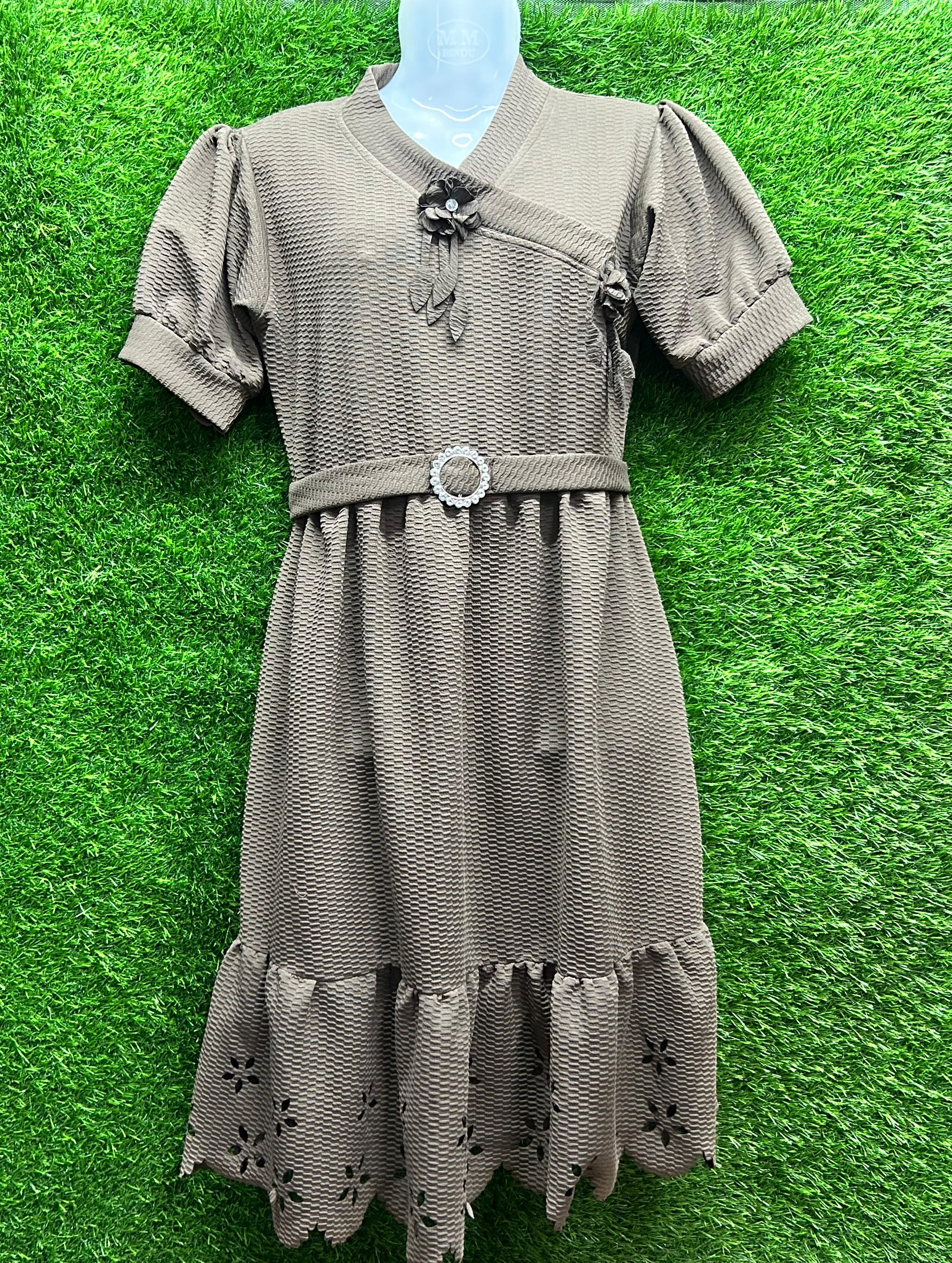 Women’s Chocolate Brown Textured Midi Dress with Floral Detail | Belted Western Dress