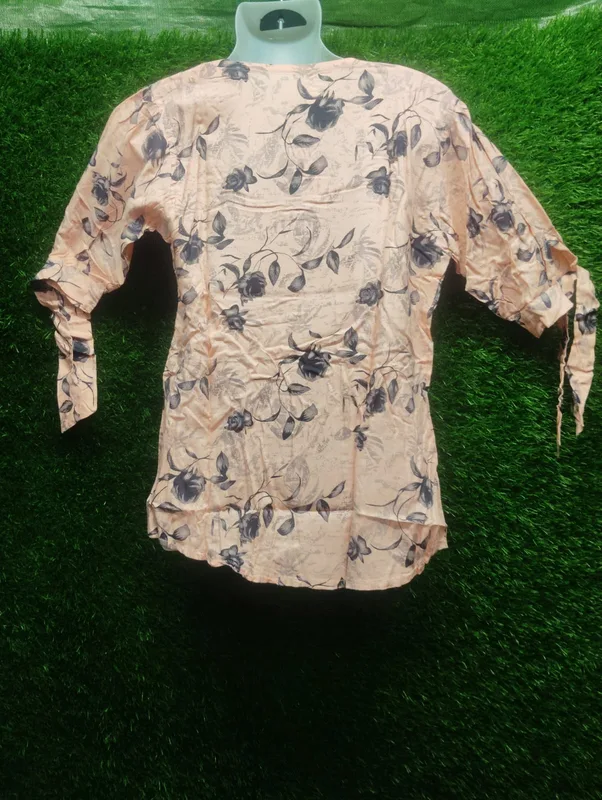 Beige floral printed top with elegant V-neck design for a classy look.