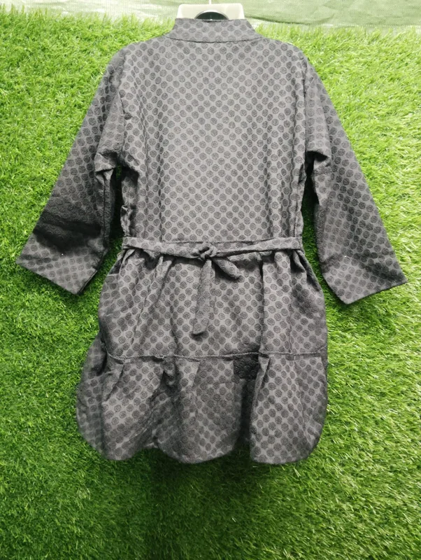 Elegant black western frock top with self-textured fabric and embroidered front panel. Features a stylish tie-up neckline and flared fit for a modern look.