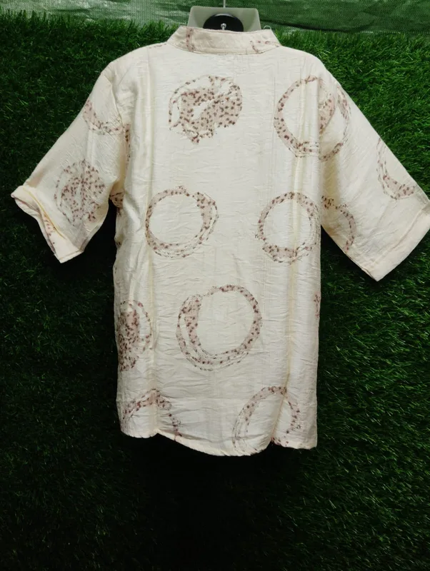 Premium cotton blend beige shirt style top with circular prints and front button design