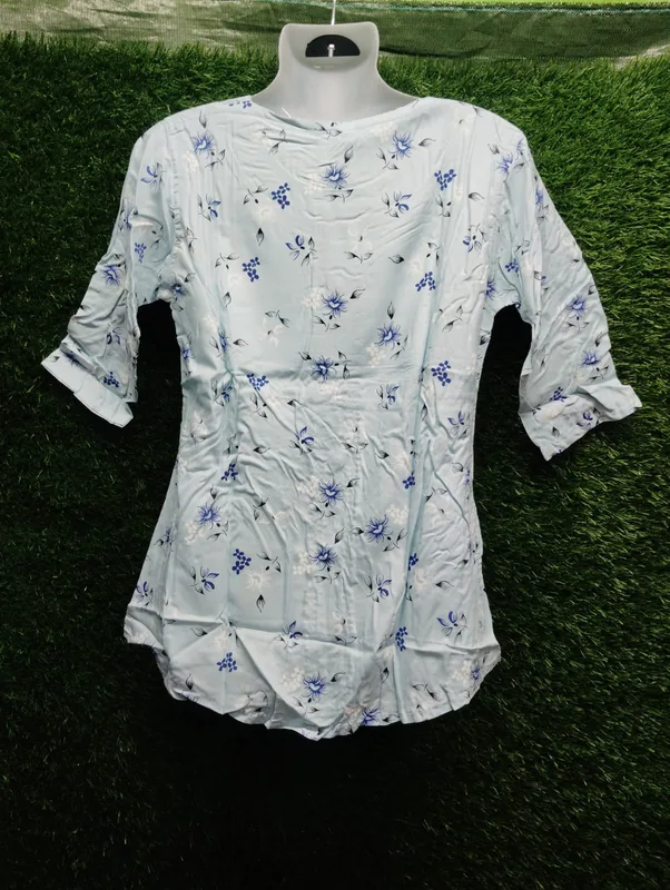 Attractive sky blue floral top with front buttons and soft fabric.